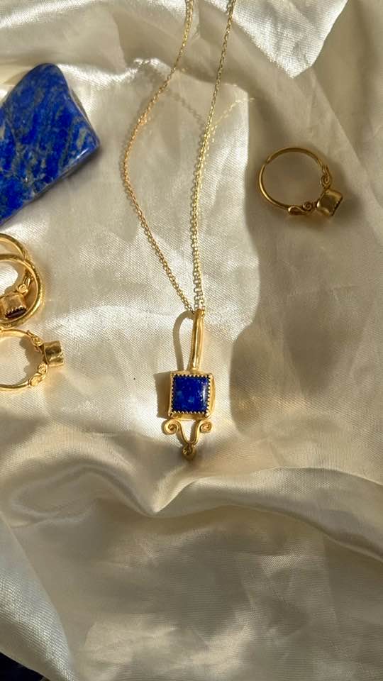 Esta pieza única nace de mi fascinación por la belleza natural del lapislázuli en bruto, una piedra que desde tiempos inmemoriales ha sido símbolo de sabiduría y conexión espiritual. Cada fragmento que selecciono tiene una forma y tamaño irrepetibles, reflejando su autenticidad y la historia que lleva consigo desde el corazón de la tierra. El diseño se inspira en Amarna, la ciudad de luz y arte de la antigua Egipto, un lugar donde la creatividad y la innovación florecieron bajo el sol dorado del desierto. La plata bañada en oro de 24 quilates captura esa misma calidez, abrazando la piedra como si fuera un tesoro hallado en las arenas del tiempo.